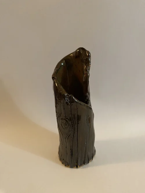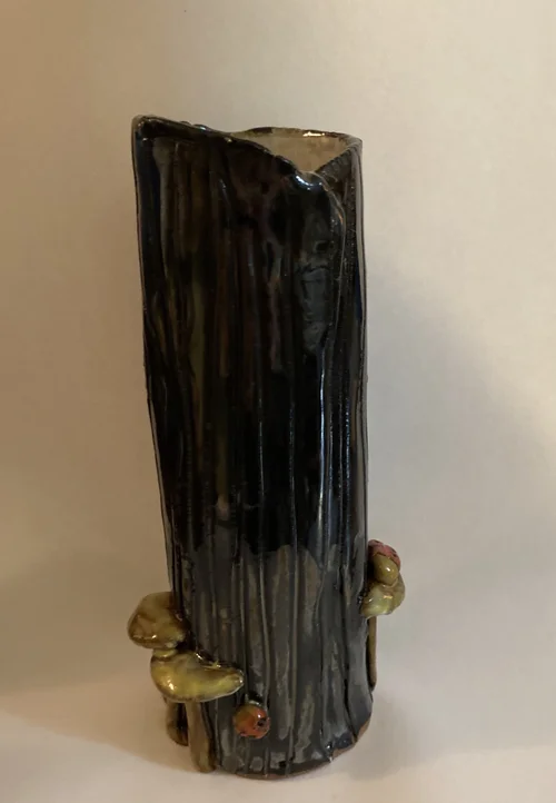 Tree stump Vases are hand built pottery 2 with mushrooms and are approximately 5-6 inches tall.